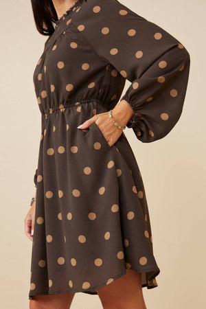 Polka Dot Woven Fabric * Ruffle Neckline * Dress Lining Measurements: Size Length Waist Small 35" 13.5" Medium 35.75" 14.25" Large 36.5" 15" The measurements in the chart above reflect the garment laying flat. For body measurements please visit our Size Guide. Model Stats: * Height: 5'6" * Bust: 32" * Waist: 23" * Hip: 35" * Wearing Size: S Material & Care: * 100% Polyester * Hand Wash Cold * Hang Dry