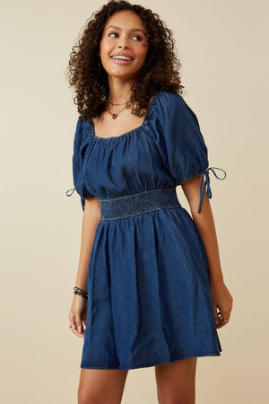Smocked Waist Tie Sleeve Denim Tencel Dress Features: * Washed Tencel Fabric * Smocked Waist * Sleeves with Tie Closure Measurements: Size Length Chest Waist Small 35" 18" 13.5" Medium 35.75" 19" 14.25" Large 36.5" 20" 15" 1XL 40" 23" 17.5" 2XL 40.75" 25" 19" 3XL 41.5" 27" 20.5" The measurements in the chart above reflect the garment laying flat. For body measurements please visit our Size Guide. Model Stats: * Height: 5'8" * Bust: 34" * Waist: 24" * Hip: 35" * Wearing Size: S * Plus Model Height: 45" * Plus Model Bust: 5’10" * Plus Model Waist: 50" * Plus Model Hip: 36" * Plus Model Wearing Size: 1XL Material & Care: * 100% Tencel * Hand Wash Cold * Hang Dry